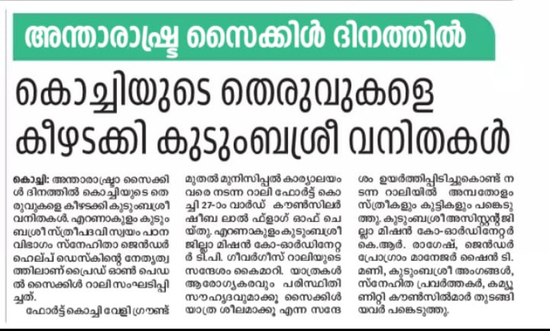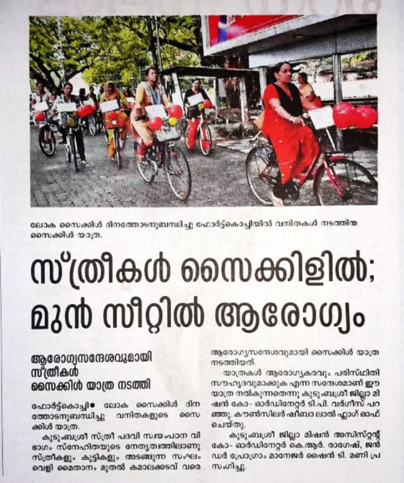 ''pride on pedal'snehithakoppam sneha savari world cycle day observation at fortcochi -malayalamanorama dated 4/3/2019