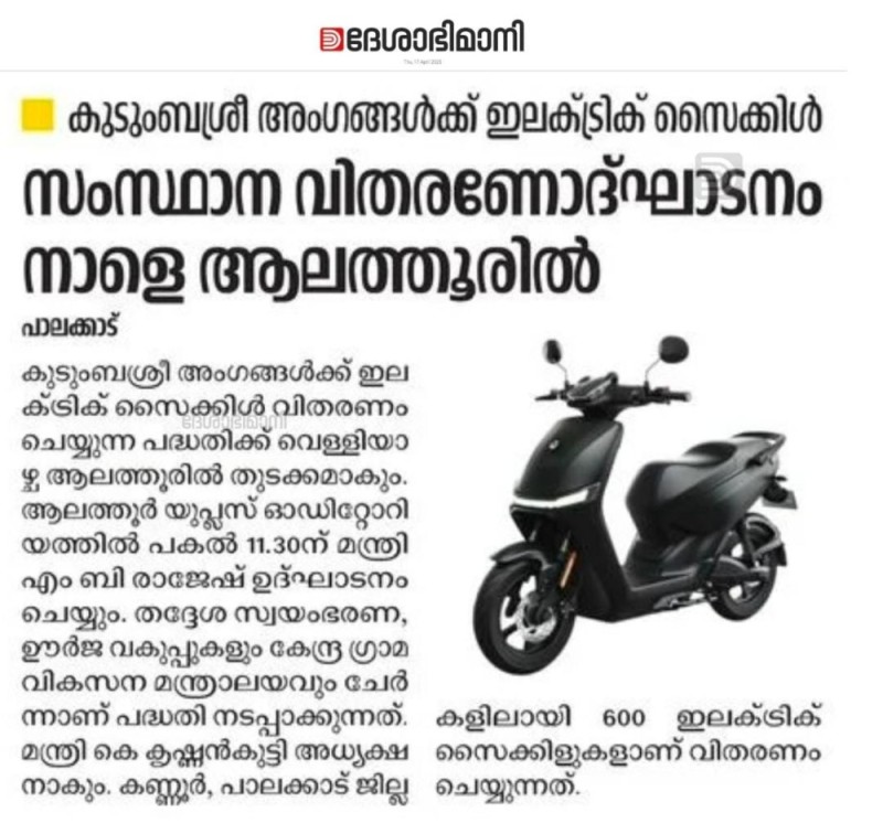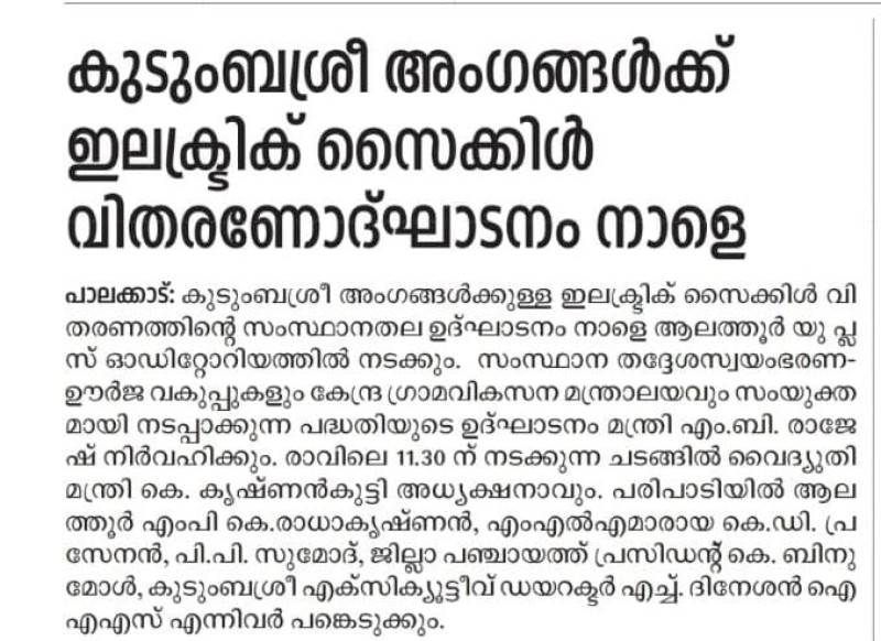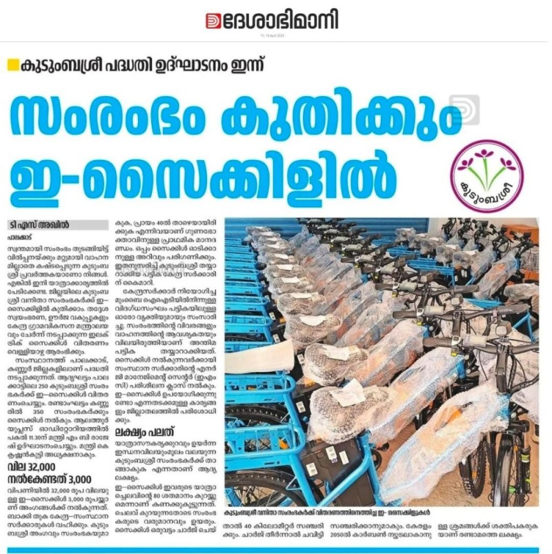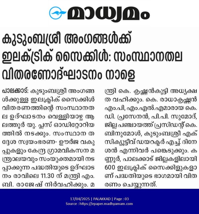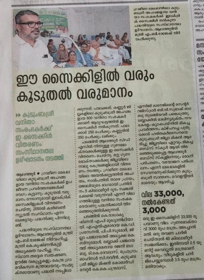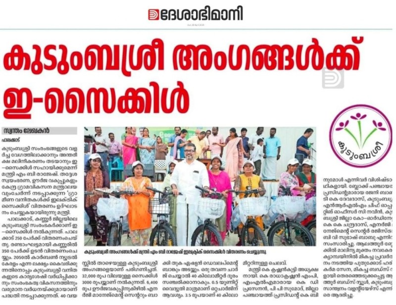 കുടുംബശ്രീ അംഗങ്ങൾക്ക് ഇലക്ട്രിക്ക് സൈക്കിൾ -17/04/2025