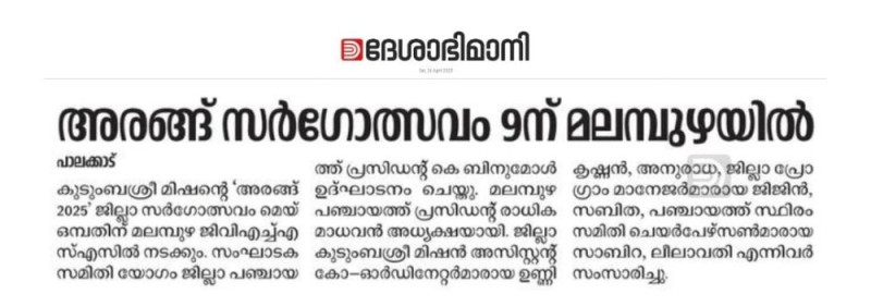അരങ്ങ് സർഗോത്സവം മലമ്പുഴയിൽ- 26/04/2025
