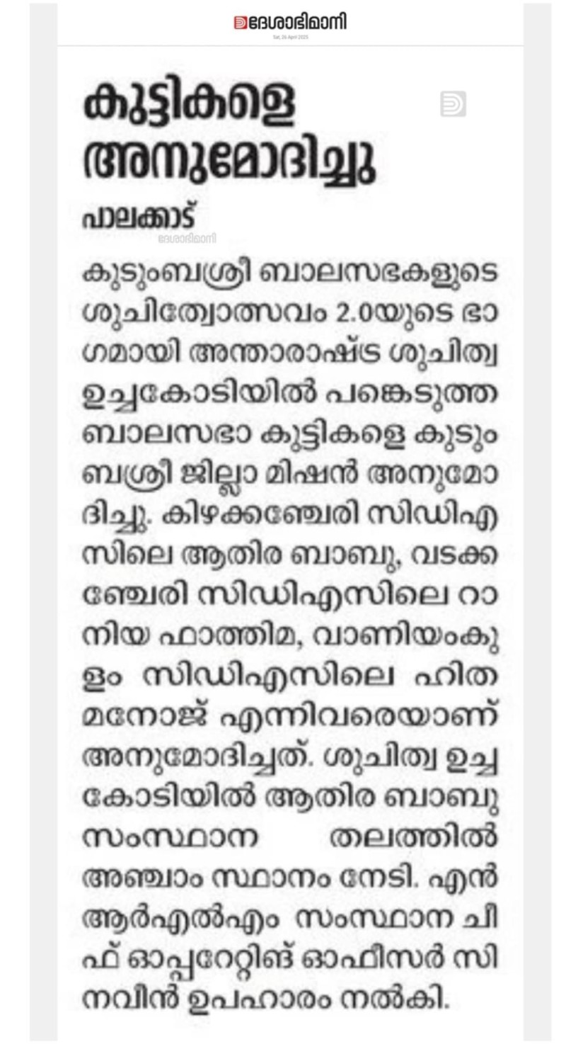 അന്താരാഷ്ട്ര ശുചിത്വ ഉച്ചകോടിയിൽ പങ്കെടുത്ത ബാലസഭാ കുട്ടികളെ ജില്ലാമിഷൻ അനുമോദിച്ചു-26/04/2025