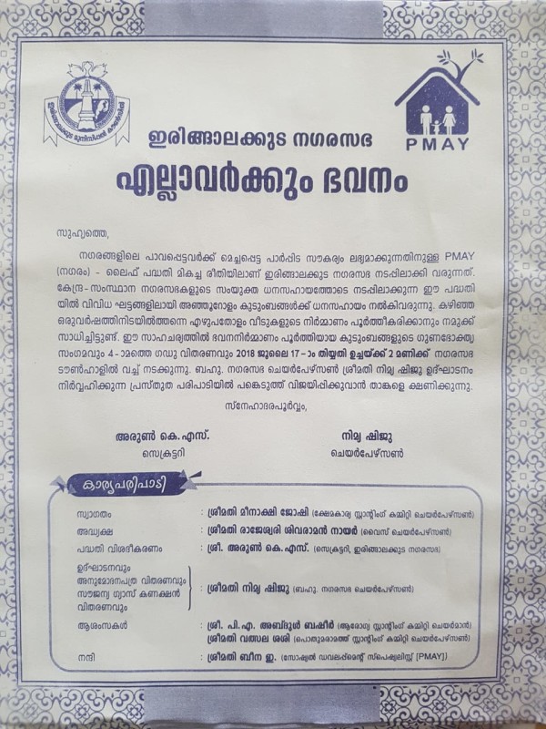 PMAY implementation started in Irinjalakuda Municipality in one year back. In this year, we got sanctioned for 550 houses and construction started 398 houses. 67 houses completed construction during the period and ULB decides to congragulate the families who have completed the construction in a timely manner and helps the ULB to achieve the progress.