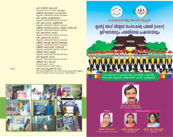 Start Up Village Entrepreneurship Programme is a Centrally Sponsored one. District level inauguration is scheduled at Kodakara Block Panchayat Hall on 29-07-2018. Honourable Minister. Prof. C Raveendranath will inaugurate the function. District Panchayat President Smt. Mary Thomas will preside over the function.