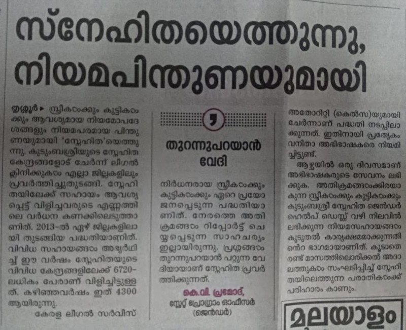 Snehitha for legal support (Mathrubhoomi 18.06.2019)