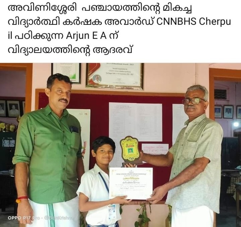 അവിണിശ്ശേരി പഞ്ചായത്തിലെ മികച്ച വിദ്യാർത്ഥി കർഷക അവാർഡ് 2023-24 നേടിയ നമ്മുടെ ബാലസഭ അംഗമായ അർജുനെ വിദ്യാലയം ആദരിക്കുന്നു