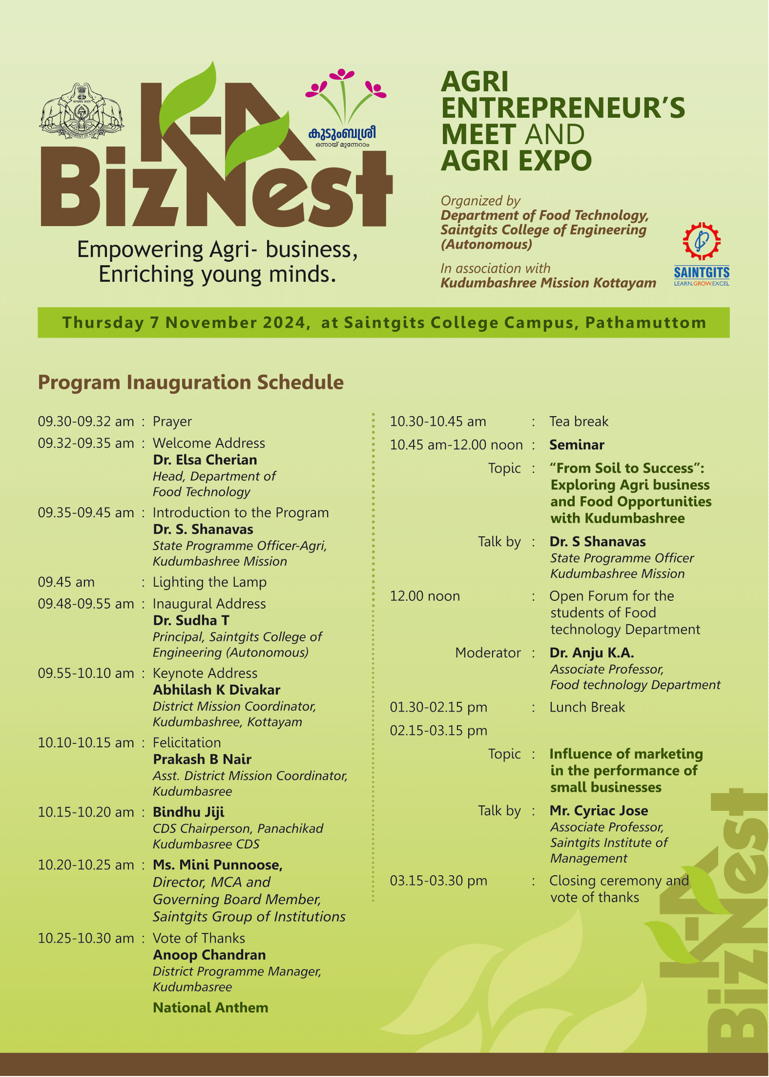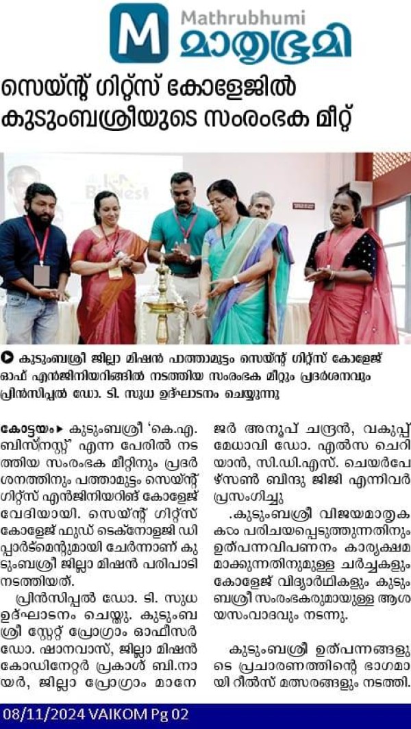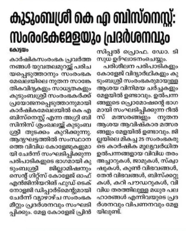 An Entrepreneurship Meet & Exhibition was organized as part of the KA Biz Nest Programme of Kudumbashree at Saintgits College of Engineering Campus, Pathamuttam, Kottayam on 7 November 2024. The programme was organized by Kudumbasree Kottayam District Mission in association with the Food Technology Department of Saintgits College of Engineering.