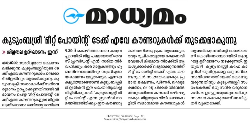 14/03/2026-കുടുംബശ്രീ മീറ്റ് പോയിന്റ് ടേക്ക് എവേ കൗണ്ടറുകൾക്ക് തുടക്കമാകുന്നു