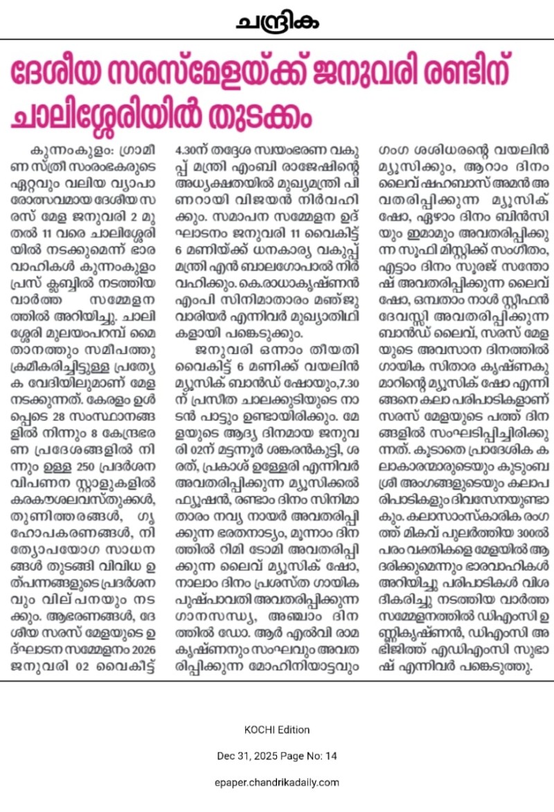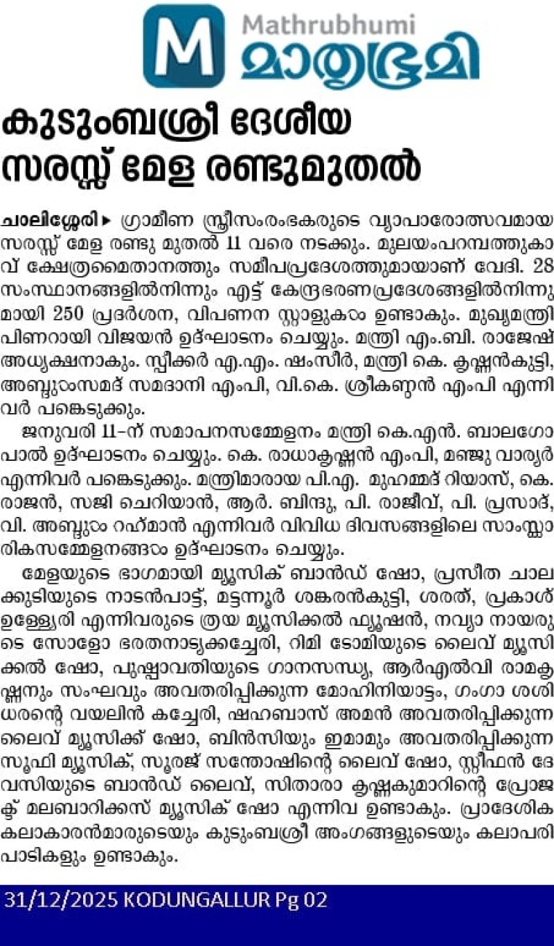 31/12/2025- കുടുംബശ്രീ ദേശീയ സരസ് മേള രണ്ടുമുതൽ