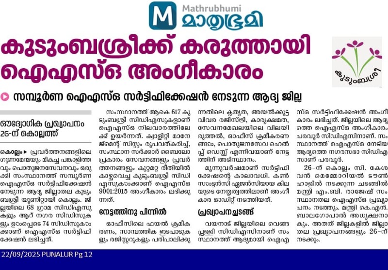 22.09.2025 | Kollam District CDS ISO Certification | Mathrubhumi