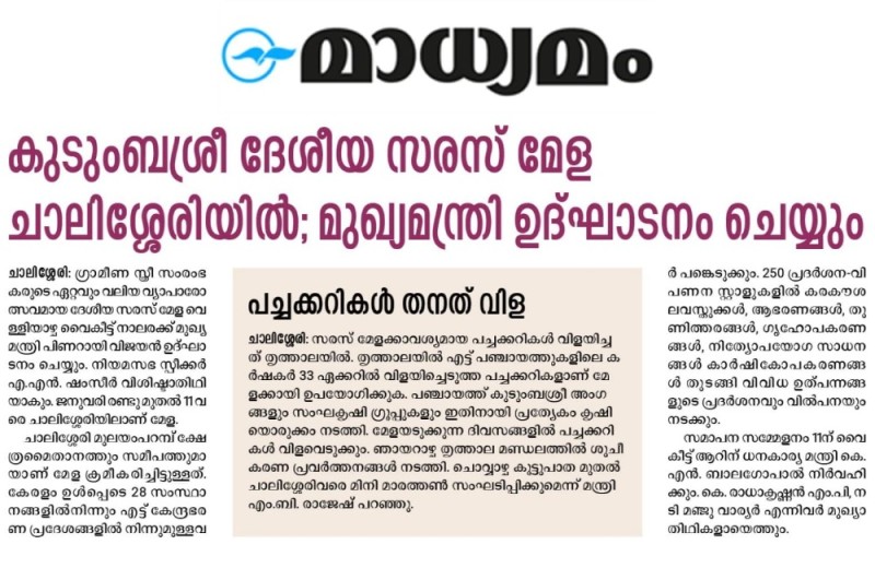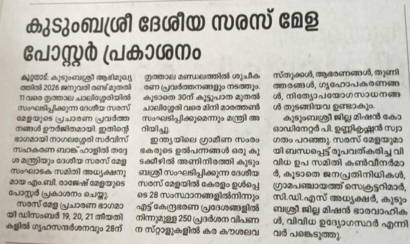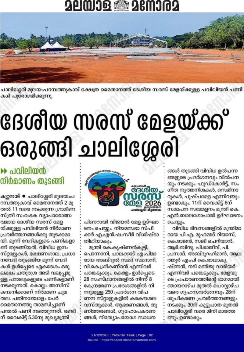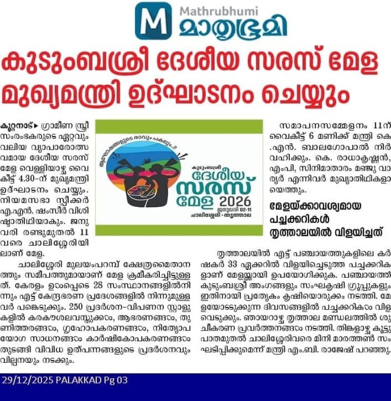 30/12/2025- കുടുംബശ്രീ ദേശീയ സരസ് മേള ചാലിശ്ശേരിയിൽ; മുഖ്യമന്ത്രി ഉദ്ഘാടനം ചെയ്യും