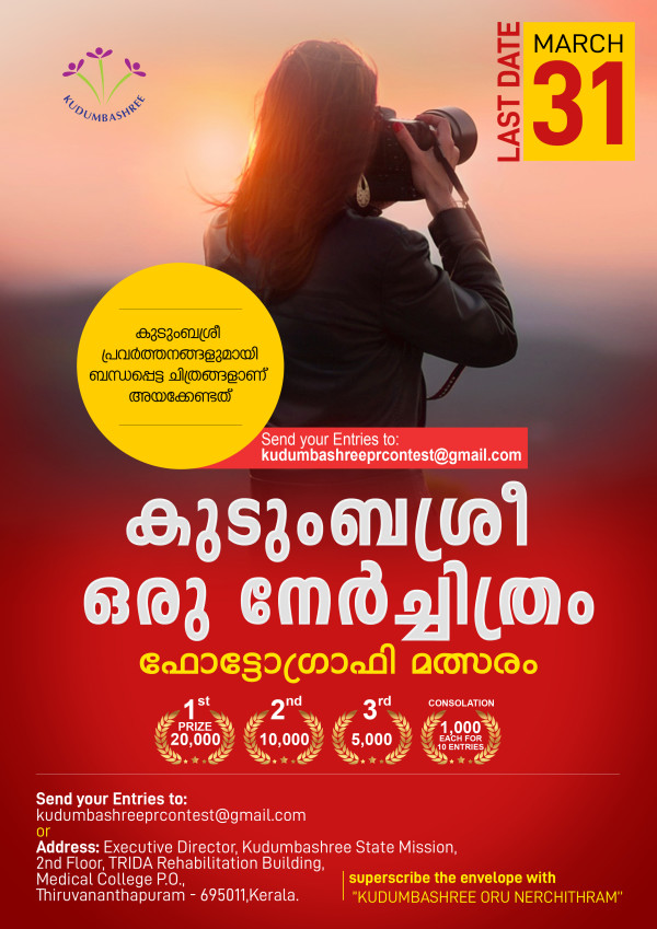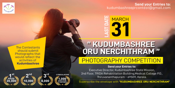 ഫെബ്രുവരി ആറ് മുതൽ മാർച്ച് 31 വരെ സംഘടിപ്പിച്ച ഫോട്ടോഗ്രഫി മത്സരത്തിന് മികച്ച പ്രതികരണമാണ് ലഭിച്ചത്. മംഗളം ദിനപ്പത്രം മുൻ ഫോട്ടോ എഡിറ്റർ ബി.എസ്. പ്രസന്നൻ, ഏഷ്യാവിൽ ന്യൂസ് പ്രൊഡക്ഷൻ ഹെഡ് ഷിജു ബഷീർ, സി-ഡിറ്റ് ഫാക്കൽറ്റിയും ഫോട്ടോ ജേർണലിസ്റ്റുമായ യു.എസ്. രാഖി, കുടുംബശ്രീ അക്കൗണ്ട്സ് ഒാഫീസർ എം. രജനി എന്നിവരായിരുന്നു ജൂറി അംഗങ്ങൾ. പത്ത് മികച്ച ഫോട്ടോകൾക്ക് 1000 രൂപ വീതം പ്രോത്സാഹന സമ്മാനവുമുണ്ട്. കുടുംബശ്രീയുടെ പ്രവർത്തനങ്ങൾ പ്രതിപാദിക്കുന്ന ചിത്രങ്ങളാണ് മത്സരത്തിന് ക്ഷണിച്ചിരുന്നത്.