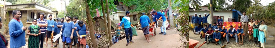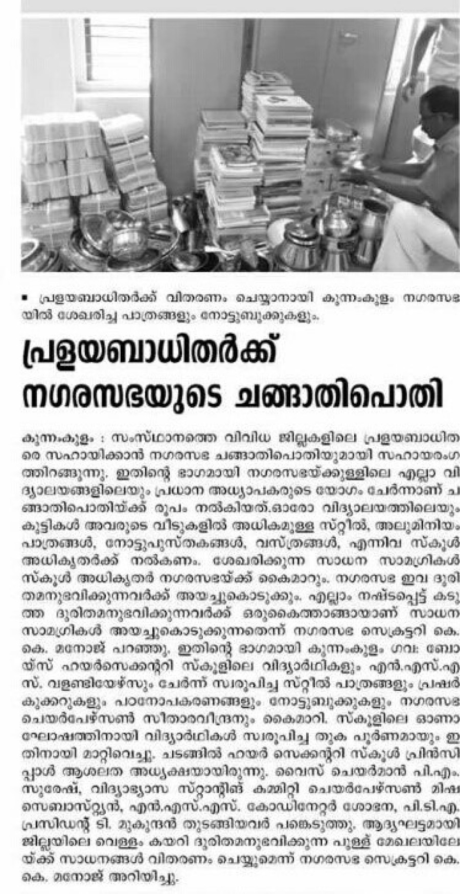 Kunnamkulam ULB Staffs being a role model team, where expanding their flood relief activities to the various parts of kerala and with in the ULB areas by providing cleaning services, food, clothes, notebooks & study materials etc. A group of 20 kunnamkulam ULB staffs were engaged for 2 day cleaning activities at colonies in thiruvalla municipal area such as Aadambadham, Mangallasery & Njavanamkuzhi under the supervision of Kunnamkulam Municipal Shri K.K Manoj