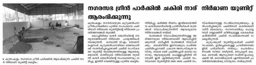 The primary stages of Coconut Shell Defibering Unit has begin at Green Park, Kunnamkulam. The production is carried out under the leadership of Coir Board, Kochi. The idea of starting Coconut Shell Defibering Unit at Green Park, Kunnamkulam has been raised by Dr. Thomas Issac, Hon. Minister of Finance during his visit at Green Park, Kunnamkulam. A new building has been constructed for the starting the unit with the support of Coir Board, Kochi. The reprentatives of Coir Board, Kochi visited the place and gave instructions for planting the machineries. Coir Pith and Broken Fiber are the products receiving from the Coconut Shell Defibering Unit. Among these, the product Coir Pith can be used in waste management plant. Around 8000 coconut shells can be buried daily in the unit.